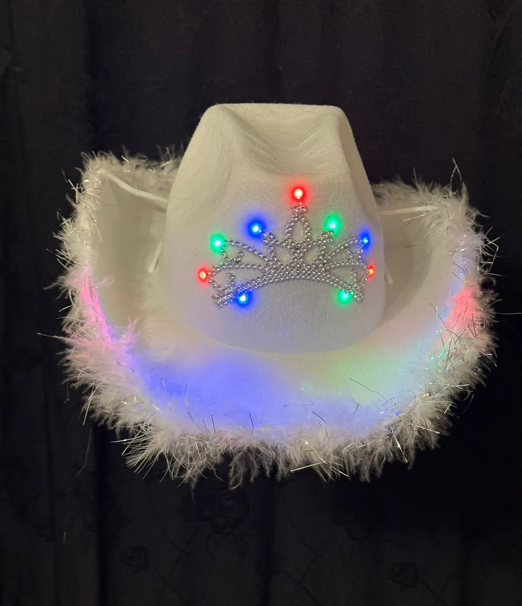 Sombrero cowboy de paño blanco con luz multicolor y corona. Pilas incluídas